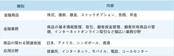 ·弊社は國(guó)內(nèi)外の金融グループ、銀行、証券會(huì)社等の大手お客様のためにソフトウェアのオフショア開発サービスを提供し、現(xiàn)在は主に下記の金融商品と金融業(yè)務(wù)の分野に関わっています: